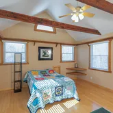 spa-style bathroom with a Jacuzzi tub. Upstairs, there’s a home office that shares a bathroom