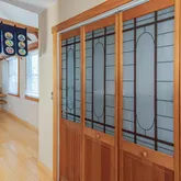 corner of the house on the first floor with glass doors that look out onto the pond. Here find a