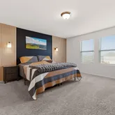 The expansive primary suite features a custom headboard wall with sconce lighting and elegant slatted wood panels. Upstairs, you’ll find a spacious secondary living area along with generously sized secondary bedrooms.