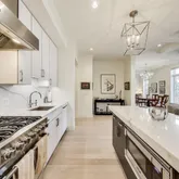 The gourmet chef's kitchen is a culinary dream, outfitted with top-of-the-line Viking appliances, including a 36-inch refrigerator, a 30-inch five-burner gas range with a vented hood, and a convenient microwave drawer in the island. Custom glossy white lacquer cabinets, Calacatta Vagli marble counters and backsplash from the Apuan Alps region in Tuscany, Italy and Waterworks faucets complete this stunning space.