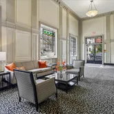 The Bathroom with a vanity for storage and a window too! Residents enjoy a...Nestled in the heart of prestigious Kalorama, this condo in The Farnsboro offers an inviting open floor plan anchored by rich hardwood flooring and recessed lighting, creating a warm, sophisticated ambiance throughout.