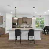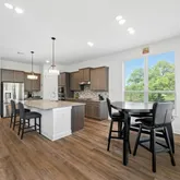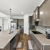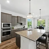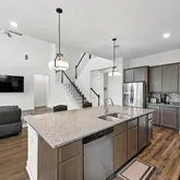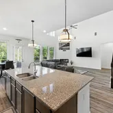 Step into a light-filled two-story living room featuring soaring ceilings and a sleek 48” Allusion electric linear fireplace; a modern showpiece that creates warmth and style. The open-concept floor plan flows effortlessly into the gourmet kitchen, complete with granite countertops, 42” cabinets, built-in stainless steel appliances, a large center island, and walk-in pantry—perfect for entertaining or everyday family life.