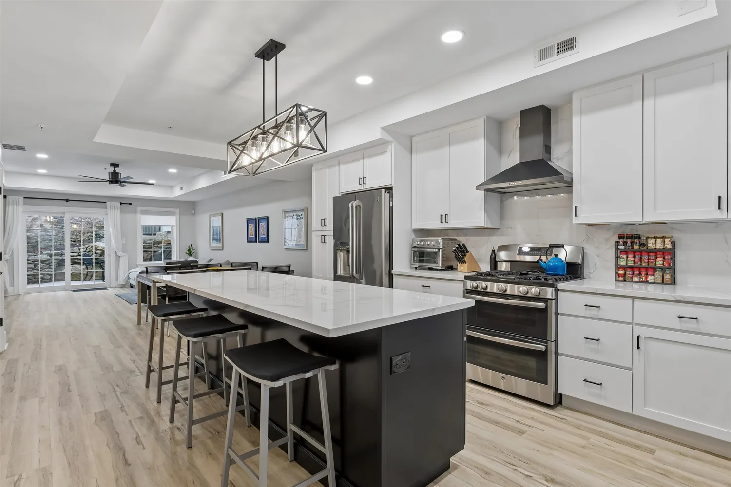 Designer lighting elevates the space, highlighted by a geometric pendant fixture over the island and complemented by recessed lighting throughout. Light, natural-toned flooring adds warmth while maintaining the bright and airy feel.