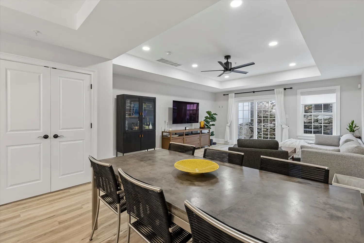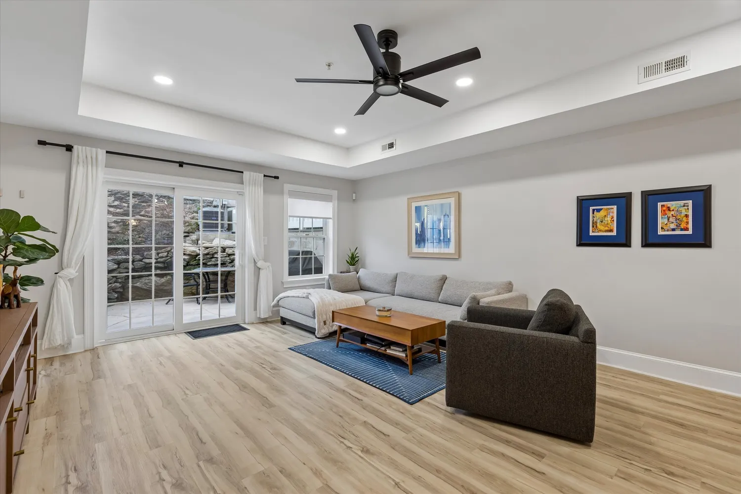 Inside, you’ll find hardwood flooring throughout and a bright, open-concept layout with recessed lighting, custom trim, and stylish finishes. The main level features a spacious living area with tray ceiling, flowing into the dining space and out to sliding glass doors leading to a private rear patio—perfect for indoor-outdoor living.