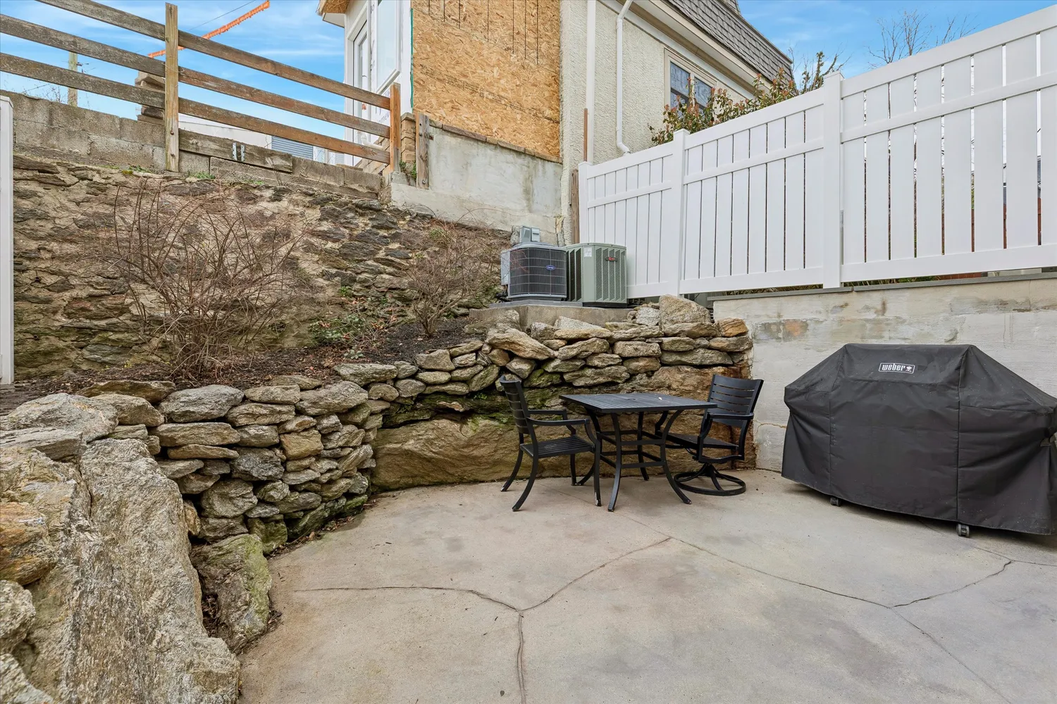 The fenced-in patio offers a cozy, low-maintenance outdoor space perfect for dining or relaxing.