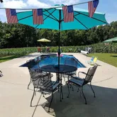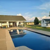 - Large concrete patio area around the pool and pool house