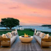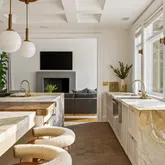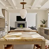 From the moment you enter the grand foyer, sweeping water views draw you through glass doors framed by a dramatic fireplace and coffered ceilings—setting the stage for a home designed to celebrate both luxury and landscape. The magnificent chef’s kitchen is a true showpiece, centered around an oversized waterfall marble island and equipped with Gaggenau and L’Atelier appliances, radiant heated stone floors, and a charming breakfast room with a custom circular banquet. Doors open to covered porches and an outdoor kitchen, seamlessly blending indoor and outdoor entertaining.