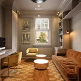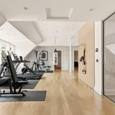 The third floor is devoted to wellness and work with a gym featuring an activity wall, steam bath and sauna, private massage spa room, additional bedrooms with en-suite baths, and beautifully appointed offices—including one connected to the primary suite by a spiral staircase and dressing room.
