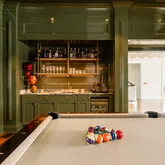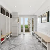 - RoomDescription 1: FIRST FLOOR: Grand foyer w/expansive water VIEWS through glass doors w/fireplace/coffered ceiling, Kitchen w/oversized waterfall marble center island/Gagganau & L'Atlier appliances w/radiant heated stone floors/wine fridge/breakfast room w/custom circular banquet/door to heated porch & outdoor kitchen, Walk-in pantry w/custom cabinets/counters/shelving, Mudroom w/door to driveway/custom cubbies, Half bath, Family room w/fireplace/custom bookcases w/sliding ladder/doors to porch, Dining room w/coffered ceiling/dentil molding, Living room w/fireplace/piano alcove/doors to covered porch/pocket doors, Den/library w/lacquer painted walls/book shelves, Billiard room w/lacquer painted walls w/panelling w/wet bar/beverage fridge/glass & brass shelving, Guest powder room, Elevator access, Multiple covered porches