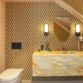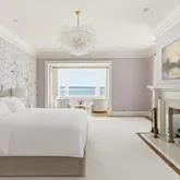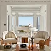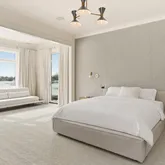A dramatic staircase leads to the second floor where the luxurious primary suite offers a private sitting area, balcony with water views, a custom dressing room, and an exquisite marble spa bath with soaking tub and glass-enclosed shower. Additional bedrooms feature en-suite baths, several with private balconies, while a stylish lounge provides a comfortable retreat.