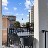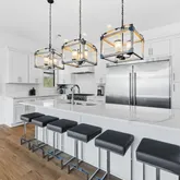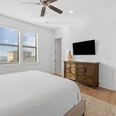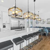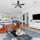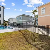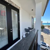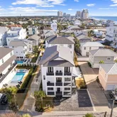 On the first level, indulge in comfort with 3 king suites, a cozy living room, and the added delight of an in-home theater featuring a large screen, eight recliners with drink holders, and extra bean bags for casual seating. Step outside to a glittering pool, a centerpiece hot tub, and a spacious fenced-in backyard with ample grilling and dining accommodations The second level unveils the main living space, featuring a primary living room, a stunning chef's kitchen, and additional 3 king suites - one with access to the shared balcony and a view of the Gulf. Floor-to-ceiling windows flood the open floor plan with natural light, providing access to a long balcony overlooking the neighborhood and offering another view of the Gulf. The swanky living room is adorned with luxurious fabrics, bold patterns, and pops of cheerful color. The bar and dining area create the perfect setting for gathering and entertaining, equipped with a large professional refrigerator, a Viking six-burner gas stove, and ample pantry space.