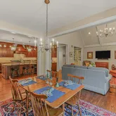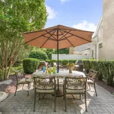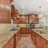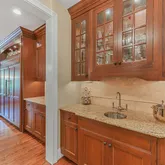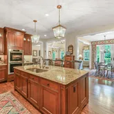 The heart of the home is a gorgeous Chef’s Kitchen with rich, ample cabinetry and a layout that is ideal for entertaining. The upgraded appliances include a full-size Subzero Refrigerator-Freezer combination large enough to hold everything that you need for the most elaborate gathering. To the side of the Kitchen, a Butler’s pantry connects the Kitchen to additional pantry storage and the lovely Formal Dining Room. The adjacent eat-in breakfast room leads to French doors that open to a spacious and very private paver patio with lush views and foliage.
