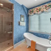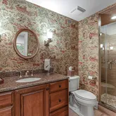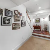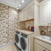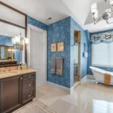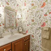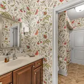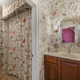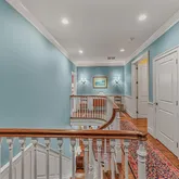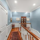On the top level, you will find a uniquely designed Main Bedroom. Additional square footage, smartly borrowed from a redesign of the two-story Foyer, enables large his and hers closets. The ensuite bathroom includes a deep free-standing clawfoot soaking tub, separate his and hers vanities, and a large shower. All of this is elevated even more by the elegant wallpaper background. In addition to the Main Bedroom on this level, you will find two additional bedrooms connected by a large, well-designed Bathroom and a Laundry Room.