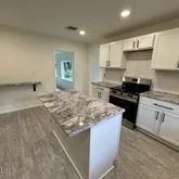 this home is freshly painted with refinished hardwood flooring. The new kitchen cabinets have granite counter tops, subway tile backsplash, undermount sink, lazy susan, hidden trash bin, an island and a coffee bar. New recessed lighting, ceiling fans,