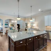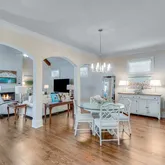 kitchen. High-end stainless-steel appliances, including a gas cooktop, double ovens, and a French-door bottom mount refrigerator with pendant lighting. A walk-in pantry offers additional storage, ensuring a clutter-free workspace. Open to the dining and living areas, this thoughtfully designed kitchen is perfect for both daily living and entertaining. The living room boasts vaulted ceilings with exposed