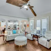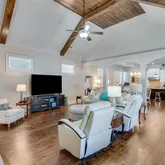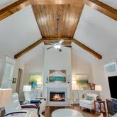 wooden beams with a floor-to-ceiling fireplace with gas logs creates a cozy focal point. Soft neutral tones and natural light from the high-set windows enhance the open and airy feel of the space. The primary suite on the main level is a serene retreat, offering a blend of style and comfort. The bedroom features rich hardwood floors, soft neutral tones, and large windows, allowing natural light to fill the