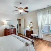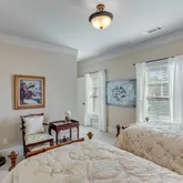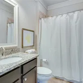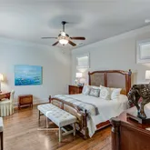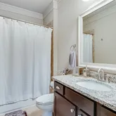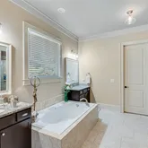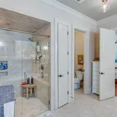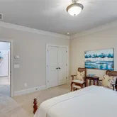space. The primary bathroom is a spa-like oasis, boasting a soaking tub, a glass-enclosed, zero entry walk-in shower with dual shower heads, and separate vanities with stone countertops. A walk-in closet provides ample storage with custom shelving, making it as functional as it is beautiful. In addition to the primary suite on the main level, this home features a spacious guest bedroom with its own