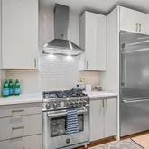 Step inside to discover a spacious, open-concept living area that seamlessly connects to a modern kitchen and large dining room, ideal for entertaining guests. The kitchen has a peninsula with room for seating and is equipped with a Bertazzoni gas range, Thermador refrigerator, gorgeous white cabinetry, as well as quartz countertops and a white chevron tiled backsplash. The spacious primary bedroom has a Juliet balcony and a large walk-in closet. The ensuite bathroom features a vanity with quartz countertops, and an oversized glass walk-in shower with tiled floor. The second bedroom also has a Juliet balcony and a spacious closet. There is an additional full bath near the second bedroom for added convenience. This unit also features stunning hardwood floors, LG stacked washer/dryer, recessed lighting and high-architectural ceilings.