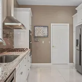 - Kitchen: Center Island, Dec Molding, Floor - Porcelain, Granite/Stone Counter, Sliding Door, Pantry, Eat-In