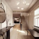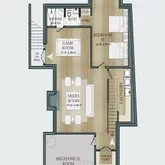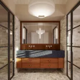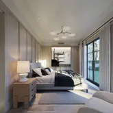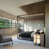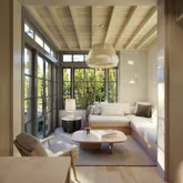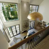 An entry foyer leads to a double-height living room with steel windows. Adjacent to the living room there is a junior suite that opens to the garden. Opposite the living room there is a spacious kitchen with a dining room that could double as a den . The kitchen is complimented with a cozy glass-enclosed sunroom, a butler’s pantry and direct access to the side entrance and mudroom.