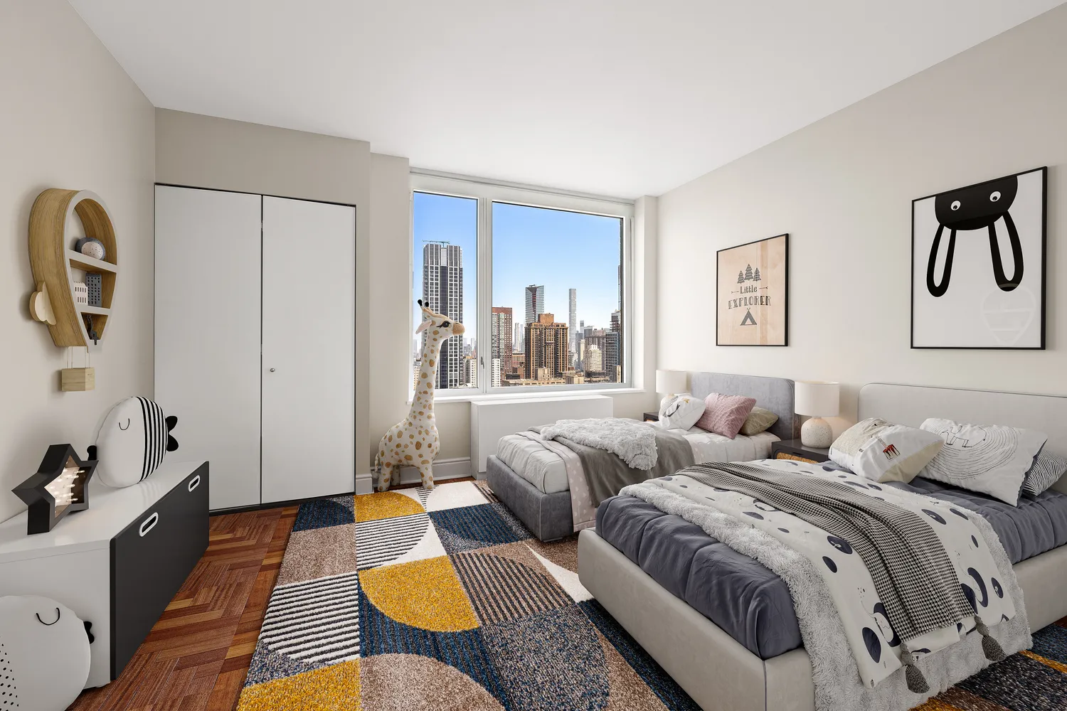 With unobstructed Northern and Eastern exposures, natural light floods the apartment by day, while the twinkling skyline provides a dramatic backdrop each night. The thoughtfully designed split-bedroom layout offers ultimate privacy and flow, beginning with a gracious entry gallery that opens into a grand living space overlooking the Upper West Side. A separate formal dining room provides flexibility and can easily be transformed into a third bedroom, home office, or den.