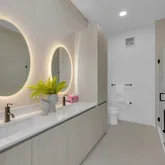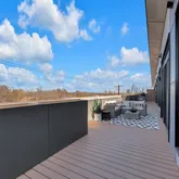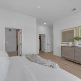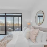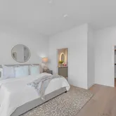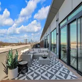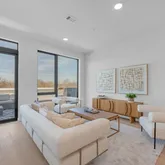 The primary suite is a private retreat, complete with a spa-like bath featuring a freestanding soaking tub, dual vanities, backlit mirrors, and an oversized glass shower. A sliding glass door opens to a private section of the expansive 400+ sq ft terrace, offering stunning views of the downtown skyline and the lively South 1st corridor - an ideal setting for morning coffee, evening entertaining, or relaxing under the Austin sky.
