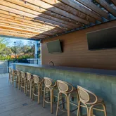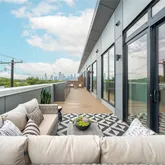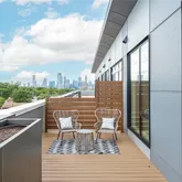 The primary suite is a private retreat, complete with a spa-like bath featuring a freestanding soaking tub, dual vanities, backlit mirrors, and an oversized glass shower. A sliding glass door opens to a private section of the expansive 400+ sq ft terrace, offering stunning views of the downtown skyline and the lively South 1st corridor—an ideal setting for morning coffee, evening entertaining, or relaxing under the Austin sky.