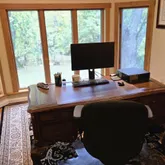 two gas fireplaces, stained glass window designs, and a library/office overlooking the