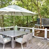 A serene outdoor hot tub provides the perfect spot to unwind while gazing at the water