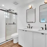 • Primary suite - generous en-suite bathroom, double-sink, matte-black fixtures, ceiling fan