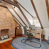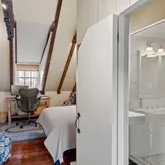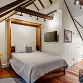 A custom turn stair leads to the 2nd level, which offers the primary bedroom with custom closets, an adjacent bathroom with a tub/shower combo, a single vanity sink, and a built-in cabinet. Also on this level is a guest bedroom (currently used as a den) with south-facing windows. The 3rd story offers a bedroom suite with a built-in Murphy bed, providing convenience for guests and serving as a home office during the day. A gas fireplace and en-suite bathroom with a glass-enclosed shower complete this level.