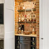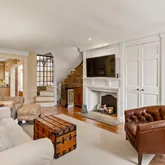 Enter the home through a vestibule with built-in coat storage, then into the living room lined with beautiful custom millwork, a built-in dry bar, and a gas-burning fireplace.