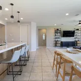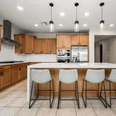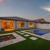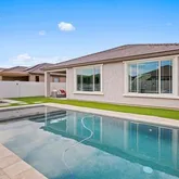 open-concept floor plan features a beautiful chef's kitchen, complete with quartz countertops with waterfall edge island, gas cooktop, built-in microwave and oven, black granite sink, and sleek wood cabinetry with black hardware. The living and dining areas lookout to serene views of your private backyard retreat. Custom sparkling pool and hot tub wrapped in travertine decking and framed with turf is perfect for entertaining or unwinding. The luxurious primary suite overlooks the pool, has a super shower with rainfall shower head, and a generous walk-in closet. The versatile bonus room offers endless possibilities: a home office, media room, formal dining, playroom.. Nestled within Harvest at Queen Creek, where you'll enjoy access to two community pools,