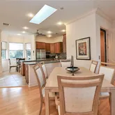 blending indoor and outdoor entertaining. The kitchen is a chef’s delight, offering wood cabinetry and plenty of prep and storage space. It blends elegance and functionality with newer stainless steel appliances including: 5 burner gas cooktop, electric double built in ovens (1