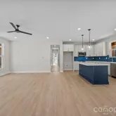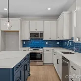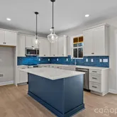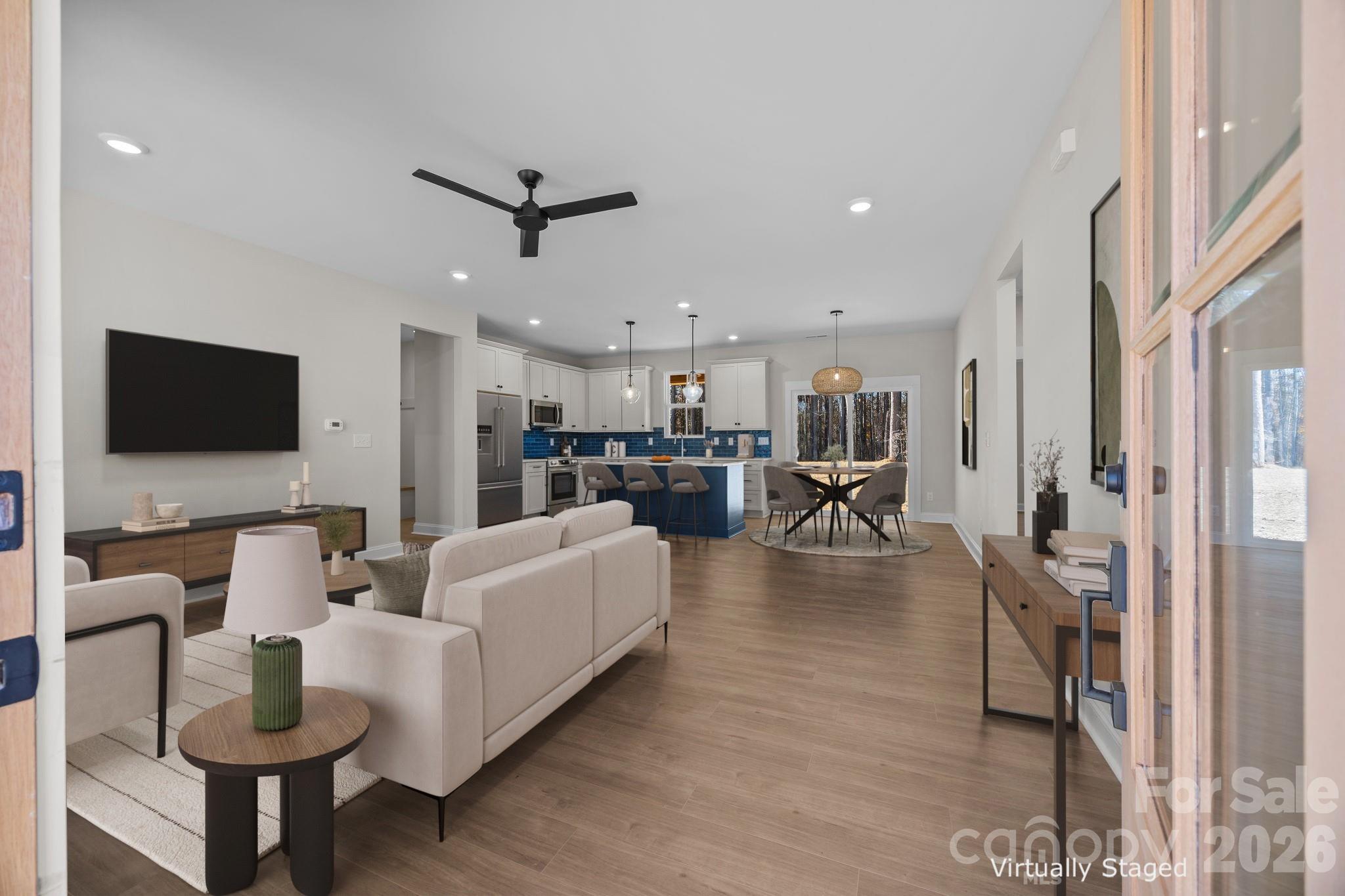 The open kitchen offers pendant lighting over the island, a walk-in pantry, and a seamless flow into the main living areas—an ideal layout for modern living. The spa-inspired primary suite includes a stand-alone soaking tub, tiled shower wall, and a calming designer color palette with crisp white ceilings. Additional highlights include a drop zone, a laundry room with cabinets and quartz counter, and added recessed lighting.