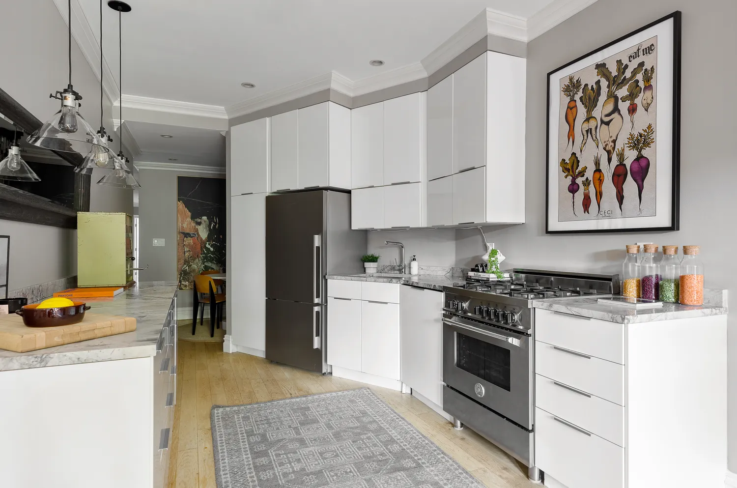 Beautifully renovated throughout, the large living room boasts a modern aesthetic with graceful original elements such as ceiling and window molding and the deep, rich fireplace mantel and surround. The gorgeous chef's kitchen is a dream come true with double height cabinets, marble countertops and high end appliances including a Bertazzoni range. A chic and sophisticated dining area is just off the kitchen. Two good sized bedrooms are set the hall past the renovated bath in the back of the apartment, offering peace, quiet and ample closet space. There is open storage in the basement to store off-season essentials.