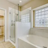 Two bedrooms are conveniently located on the main level, offering exceptional flexibility — ideal for a primary suite plus home office, guest room, or secondary bedroom. The upgraded primary bath features a frameless glass shower and spacious walk-in closet.