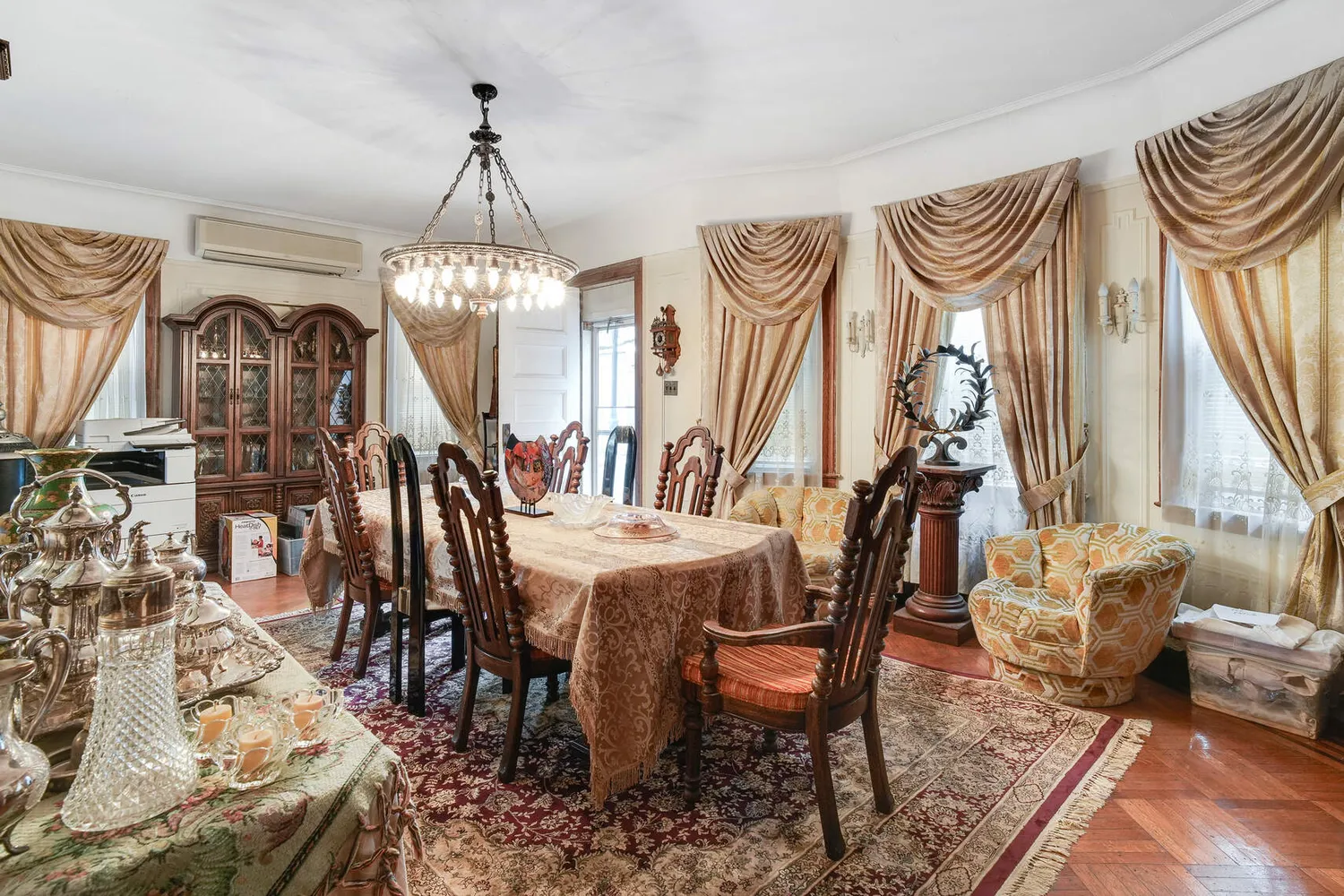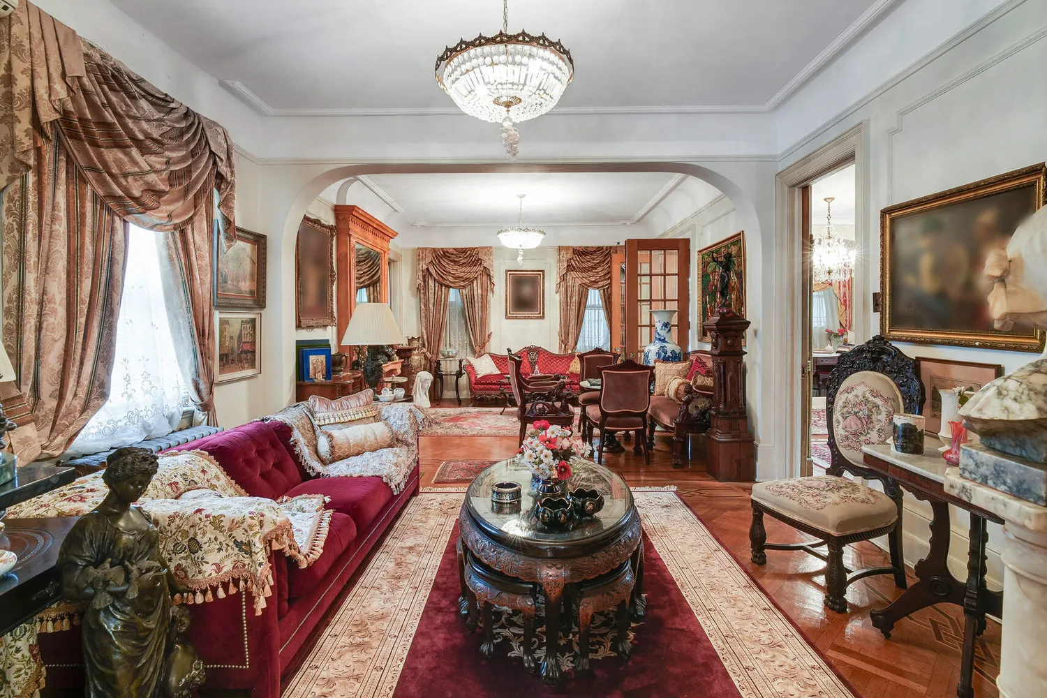 The architectural elegance of this home is immediately apparent with its impressive built-ins, stately columns, and intricate crown mouldings. High ceilings enhance the sense of space and grandeur, while the elegant double staircase serves as a striking centerpiece. The floors throughout the home feature a mix of beautiful hardwood and classic parquet, adding warmth and character to every room.