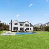 This stunning Modern Farmhouse, built in 2022, is located in prime Water Mill North, off of Head of Pond Road, across from Mill Pond. There are five king-sized bedrooms, 7 full baths and one half bath. The sun-flooded main floor includes a soaring two-story entrance foyer, high ceilings, state of the art kitchen with breakfast area, Thermador appliances, built-in Thermador wine column, a large walk in pantry and open central dining area. The living room has a masonry fireplace and sliding doors to the south-facing bluestone patio. There is a separate formal dining room with shiplap trim, a spacious first floor primary suite with high ceilings and its own en-suite bathroom, a full sized pool bathroom, a powder room, a spacious mud room, and oversized attached two car garage. Sliding glass doors lead to a large two-level bluestone patio and 20x40 heated gunite pool with water feature. The second floor includes a large primary suite with private balcony overlooking the pool and bluestone patio. Its en-suite bathroom has a floating bathtub, double sinks, radiant heated floors, and oversized walk-in shower. Each additional bedroom is en-suite with its own private bathroom. All closets are custom built and there is a separate bonus room. The partially finished basement includes a full bathroom. There is an additional 1900 square feet of unfinished basement, with high ceilings and four windows that can be easily finished and customized. A large, level driveway from Head of Pond Road leads to the attached garage, bluestone front walkway and stately covered front entrance. Mature landscaping provides complete privacy and an estate-like feeling to the property.