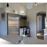 - Kitchen Appliances: Appliance Garage, Builtin Refrigerator, Dishwasher, Disposal, Free Standing Gas Range, Gas Appliances, Island, Microwave, Pantry, Solid Surface Countertop, Stainless Steel Appliance