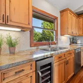 - Kitchen: 220 Volt Outlet, Cooktop - Gas, Countertop - Granite, Dishwasher, Freezer, Garbage Disposal, Hood Over Range, Hookups - Gas, Ice Maker, Island with Sink, Microwave, Oven - Built-In, Oven Range - Electric, Refrigerator, Wine Refrigerator