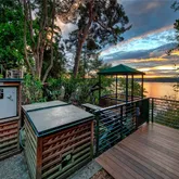 - Site Features: Cabana/Gazebo, Cable TV, Deck, Dock, Dog Run, Fenced-Partially, Gas Available, Green House, High Speed Internet, Moorage, Outbuildings, Patio, Shop