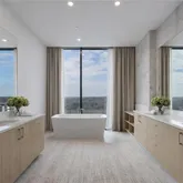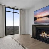 Perched high above the city skyline, the living room and entertainment space of this penthouse condo are unparalleled. At the heart of the room is a sculptural fireplace exuding effortless sophistication and warmth. The floor-to-ceiling windows frame breathtaking panoramic skyline views, bathing the space in golden sunlight by day and shimmering city lights by night. The open-concept layout seamlessly blends indoor and outdoor living.