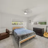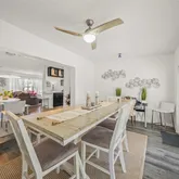 The spacious dining area is a true showstopper, boasting vaulted ceilings, dual French doors, and expansive backyard views. Whether hosting an intimate dinner or a festive gathering, this space seamlessly blends indoor-outdoor living. Retreat to the serene primary suite, a tranquil haven featuring plush carpeting, oversized windows, and ample storage. The secondary bedrooms are equally inviting, offering flexible spaces for family, guests, or a home office.