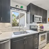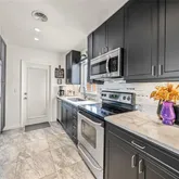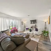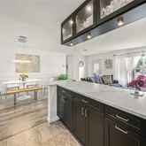 The open-concept living area features a newer roof, newer HVAC, newer hot water heater, luxury vinyl plank flooring, fresh neutral tones, and a stunning accent wall that adds character and depth to the space. A wall of PGT replacement windows bathes the home in natural light, enhancing the warm and welcoming atmosphere. At the heart of the home, the modern chef’s kitchen has been tastefully redesigned with sleek quartz countertops, bold black cabinetry, and an elegant pass-through bar, perfect for entertaining. Stainless steel appliances, upgraded fixtures, and a stylish glass-front display cabinet elevate the space, making meal prep a delight.