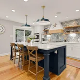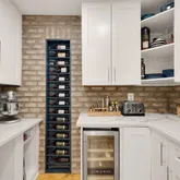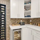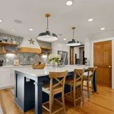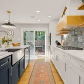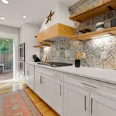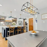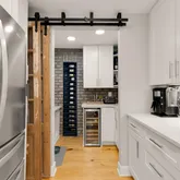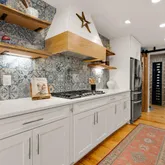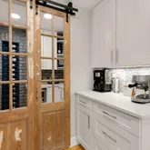 The heart of the home is the completely redesigned and expanded kitchen (2020), featuring a 36-inch custom hood vent surrounded by large format tile backsplash and custom wood open shelving. The 8-foot island with quartz countertops serves as both a focal point and functional workspace, complete with a stainless steel farmhouse sink and counter-height seating for casual dining. Premium stainless steel appliances include double wall ovens, refrigerator, cooktop, and dishwasher. A convenient pot filler above the cooktop makes meal preparation effortless. The separate coffee bar with quartz countertops provides the perfect spot for morning routines, while the new butler's pantry features built-in microwave, wine fridge, wine rack, and additional storage concealed behind reclaimed wood doors. Adjacent to the kitchen, a sizable dining area makes hosting larger gatherings seamless. Built-in speakers flow from the kitchen to the exterior, creating the perfect ambiance for indoor and outdoor entertaining.