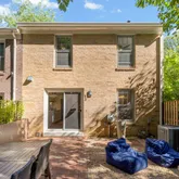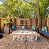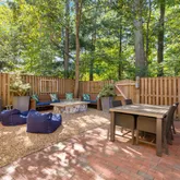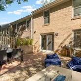 Off of the kitchen is a tree-lined backyard featuring a private fenced-in brick patio and stone lounge area. The custom concrete fire pit table with built-in benches creates the perfect gathering spot, while outdoor speakers connected from the kitchen extend your entertaining space outdoors.