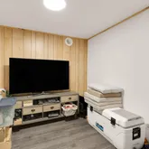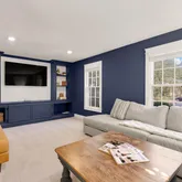 The living room showcases a custom built-in entertainment center and shelving system with a sound-deadened wall for enhanced privacy. Plush carpeted flooring maximizes comfort and coziness (2023). A convenient half bathroom off the kitchen features luxury vinyl tile floors, new toilet, vanity, and sink (2021).