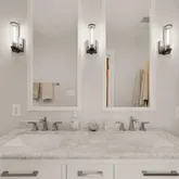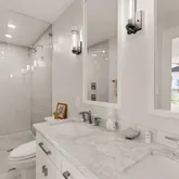 The primary suite creates an inviting sanctuary with wood window shutters and updated light fixtures. The ensuite bathroom was redesigned and expanded to include a luxury tile shower with dual shower heads, built-in glass shelving, and glass partition (2020). Additional updates include a new double sink vanity, flooring, toilet, and custom mirrors. The primary walk-in closet was relocated and expanded with a custom built-in shelving system (2020).