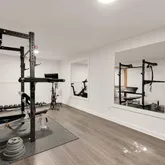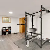 The basement is partially finished, featuring a flexible finished space that currently functions as a home gym. An adjacent storage room offers easily organized storage space, in addition to the unfinished area with a built-in work bench and shelving units.